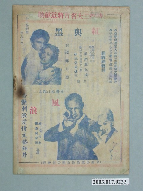 法國片《弱者女人》的電影特刊,由影劇文化服務社承印及總經銷,印刷裝訂成冊,每冊一元。封面是該片男女主角劇照,搭配「主題歌二支,風行全球」、「片上中文字幕」及「伊士曼彩色」等文案字樣。封底則是東海影業發行的愛情文藝片《紅與黑》(Le rouge et le noir , 1954)及《風浪》兩部電影廣告。內頁包括《弱者女人》的花絮、劇照、電影本事、評論、主題曲歌詞,以及男主角亞蘭德倫、三位女主角芭絲珂琵德(Pascale Petit)、梅菱娣蒙嬌 (Mylène Demongeot)、傑克琳莎莎兒 (Jacqueline Sassard)介紹等。