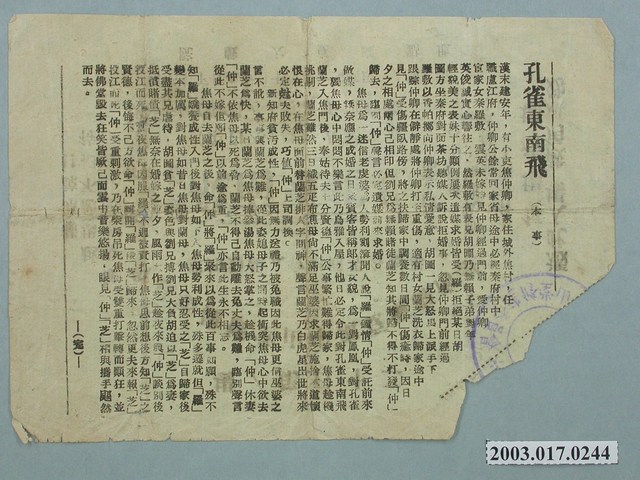 一面詳列本片放映相關資訊,包括主辦單位:「臺南縣麻豆鎮中山堂修建委員會,舉辦各界同樂會入場通知單」,電影上映時間:「民國四十四年十月二十日下午一時」,地點:「麻豆大戲院」,以及「憑此入場、截角無效」等。本件截角已撕下,上有「臺南縣麻豆鎮中山堂修建委員會」蓋印。另一面是完整的《孔雀東南飛》本事,即劇情介紹。