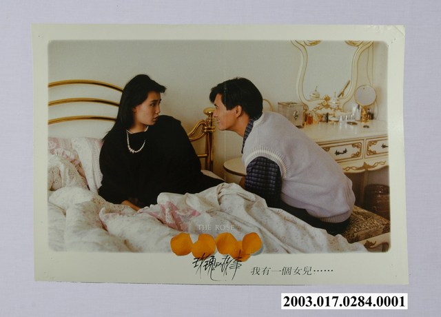 1.香港電影《玫瑰的故事》在臺上映中文橫式宣傳劇,單面。頁面使用1張劇照,留有白框,下方中間放置橘色玫瑰花瓣圖像共6片,並且有片名標準字,右邊註記文案:「我有一個女兒......」。主視覺為一白色色調歐式裝潢房間,張曼玉飾演的玫瑰身穿全黑長袖上衣,戴著一串珍珠項鍊,坐在床上,周潤發飾演的哥哥身穿淡紫色背心,靠近玫瑰微笑,玫瑰身體有點往後傾靠。四個角落有黑色小洞,推測為打釘的痕跡,右上角有一小角摺痕,中間有一道明顯對折的痕跡,整體狀況不錯。2.《玫瑰的故事》於1986年由花生映社有限公司出品,改編自亦舒的同名愛情小說,由楊凡編導,張曼玉、周潤發主演,此部電影遠至法國取景,在當時以商業規格拍攝製作算是難得,花費千萬,票房尚佳。