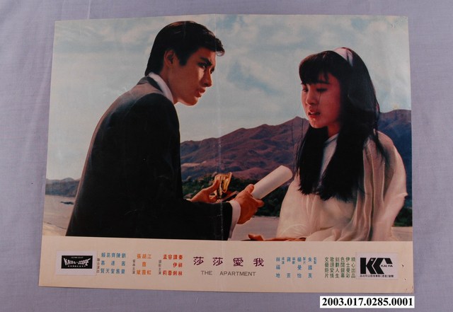1.香港電影《我愛莎莎》香港上映中文橫式宣傳劇照,單片。頁面使用1張劇照,在下方版面留有一白色區塊標註片名標準字,右邊列出製作團隊,並有一張白色方形註記「開發(香港)影業有限公司出品」貼紙,左邊是演職員表,也有一張白色「KAIFA-SCOPE」的英文Logo貼紙。劇照背景為一開闊的江邊的場景,秦祥林身穿西裝,手持一卷筒文件與金色獎杯,正對著面對前方的譚伊俐說話,譚伊俐身穿白色上衣,一頭長髮飄逸,頭戴著白色髮圈,神色苦惱。劇照右邊上下角落皆有小洞,推測為打釘的痕跡,中間有一明顯摺線,整體狀況尚佳。2.《我愛莎莎》於1970年由國泰香港影業、開發影業出品,華安電影企業有限公司發行,林福地執導,秦祥林、譚伊俐、容蓉主演。