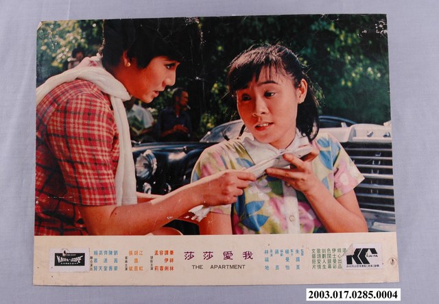 1.香港電影《我愛莎莎》香港上映中文橫式宣傳劇照,單片。頁面使用1張劇照,在下方版面留有一白色區塊標註片名標準字,右邊列出製作團隊,並有一張白色方形註記「開發(香港)影業有限公司出品」貼紙,左邊是演職員表,也有一張白色「KAIFA-SCOPE」的英文Logo貼紙。劇照背景為室外,有許多名車,一名短髮女性身穿紅色格子上衣,唯一條白色圍巾,氣質雅緻,遞給譚伊俐飾演的莎莎一件物品,莎莎位於版面右邊,身穿藍粉綠花樣的上衣,紮起馬尾拿著女人給的物品。劇照右邊上下角落皆有小洞,推測為打釘的痕跡,左上角有些微折損,表面有些刮痕,下方右側貼紙有些捲起,整體狀況有些陳舊。2.《我愛莎莎》於1970年由國泰香港影業、開發影業出品,華安電影企業有限公司發行,林福地執導,秦祥林、譚伊俐、容蓉主演。
