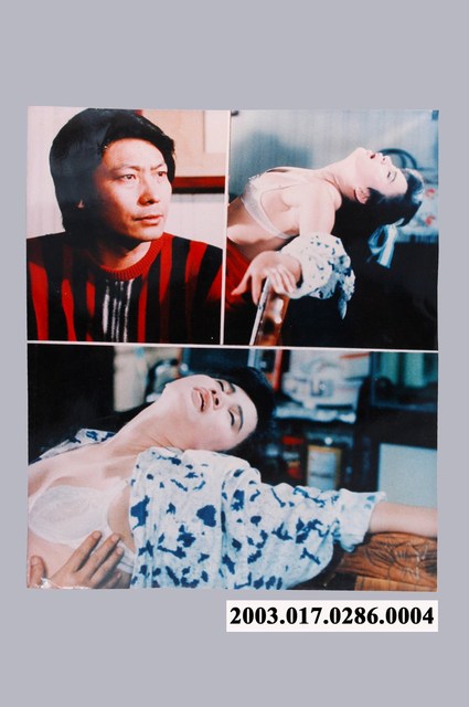香港電影《世間女子》的彩色劇照。照片內容分為3小張,上方左小張推測為男主角李建平,上方右小張為女主角狄錦僅著內衣坐椅呻吟貌,下方同是女主角狄錦僅著內衣坐椅呻吟貌。