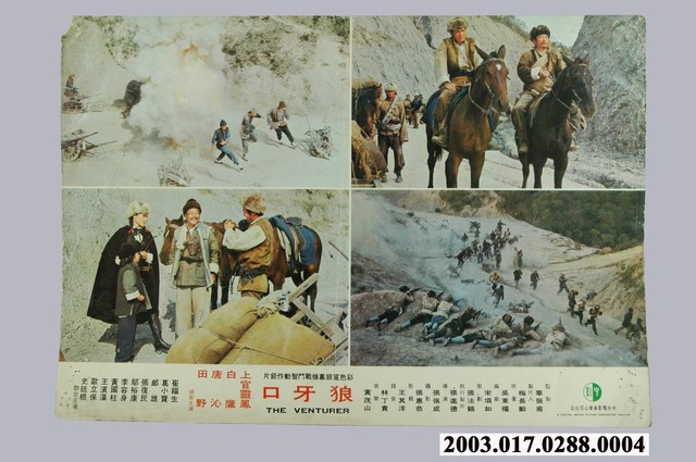1.臺灣電影《狼牙口》在臺上映中文橫式宣傳劇照,單面。頁面顯示使用4張劇照,用切割版面設計成四塊上下左右排列,下方版面留有一白色區塊,偏左標註紅色片名標準字,右邊列出製作團隊,並註記中央電影公司出品的Logo,左邊是列出主演。左上角背景為空曠的山區,一處被轟炸所以冒出濃煙,左下角是上官靈鳳與一名小孩,還有白鷹下馬迎接一位老者,右上角是白鷹與郎雄騎在馬上,在山路上望向遠方,右下角為遠景拍攝,作戰當下,一排人匍匐在前景,遠方槍林彈雨。四個角落皆有穿孔,推測為打釘的痕跡,雙方邊緣磨損嚴重,有很多交叉磨損的細痕,左上角有缺口,中間有一道明顯摺痕,紙質狀況不佳。2.《狼牙口》於1976年由臺灣中央電影公司出品,張佩成導演、王永生為動作設計,上官靈鳳、白鷹、崔福生主演,曾獲得第13屆金馬獎最佳導演。