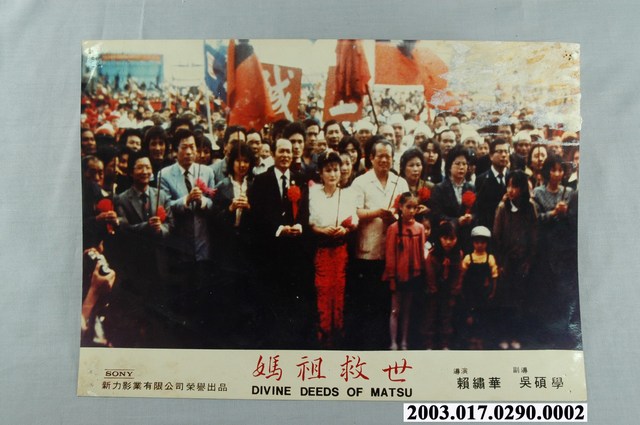 正面劇照下方另有標示本片的中英文片名「媽祖救世」(DIVINE DEEDS OF MATSU)、SONY、「新力影業有限公司榮譽出品」,以及「導演:賴繡華。副導:吳碩學」字樣。