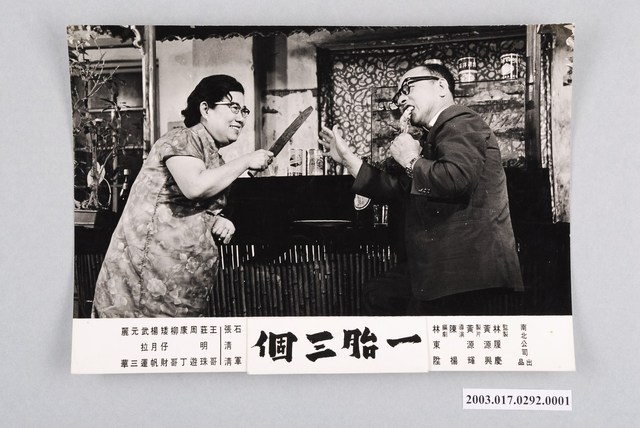 1.臺灣電影《一胎三個》臺灣上映中文橫式宣傳劇照,雙面。頁面顯示使用1張劇照,黑白色調,只在下方版面留有一白色區塊,整體有些泛黃,中間是使用貼紙貼上黑色片名標準字,書寫由右往左,右邊列出主創,左邊列出主演角色。場景為半開放的庭園,屋簷下,左邊一名豐腴的女性角色微笑卻持刀,面對右邊一名身穿西裝,頭髮稀疏,正在啃雞腿的演員,他右手舉起要阻擋對面的女人持刀過來。劇照右邊有些磨損,但狀態尚佳,邊緣平整,背面全白,左上角用藍色簽字筆註記「145-1」。2.《一胎三個》於1969年由臺灣南北電影公司,陳揚導演、林東陞編劇,石軍、張清清、矮仔財主演,集結了臺灣眾多知名臺語演員,也是知名反派演員陳揚作為導演的作品。