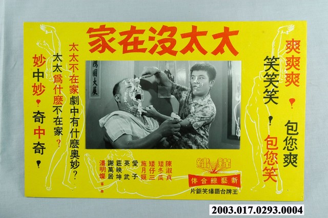 1.臺灣電影《太太沒在家》臺灣上映中文橫式宣傳劇照,橫向。頁面皆顯示使用1張劇照,位於中間版面,劇照為黑白,場景在室內,矮仔三身穿花色襯衫,鼻子沾有有刮鬍泡,卻也拿著刮鬍刀正在幫左邊的矮冬瓜全臉刮鬍,矮冬瓜嘴巴張開,看起來不知所措。底圖為鮮黃色,用白色的線描繪許三具尺度開放的女體,左右下各一,版面上方邊緣使用紅色片名標準字,書寫從左而右,右邊是文案「爽爽爽,包你爽!」、「笑笑笑!包你笑」;左側是文案「太太不在家劇中有什麼奧妙?」、「妙中妙!奇中奇!」下方左側列出演職員表,右邊是製片廠或單位的Logo,配色與風格呈現生猛有趣。2.《太太沒在家》於1969年錦繡製片廠出品,余錦玉製片,潘明燦導演、千萬編劇,陳淑貞、矮仔財主演,集結了臺灣眾多知名臺語演員。