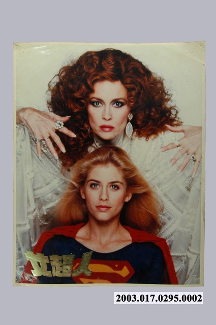 1.英美合拍片《女超人》在臺上映中文電影宣傳劇照,單面。頁面皆顯示使用1張圖像,此張使用拍攝,留有白色邊框,構圖上由女主角身穿紅色超人裝位於前景,金色頭髮往後飄揚,後方是 Faye Dunaway一頭茶色捲髮,身穿珍珠鑲嵌的白色服裝,雙手手掌張開,位於女主角上方,眼神瞪視前方。劇趙左下方有金色中文片名標準字,劇照整體有些陳舊,邊緣白框泛黃,四個角落皆有多個穿孔,推測為打釘的痕跡,劇照大致完整。2.《女超人》於1984年由美國 Pinewood Studios, Iver Heath, Buckinghamshire合作出品,由 Jeannot Szwarc執導,改編自DC漫畫中的女超人角色,由 Helen Slater, Faye Dunaway, Peter O'Toole主演。