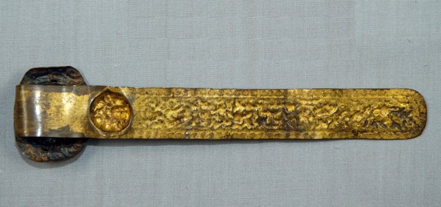 本文物為雕花鎏金髮簪,裝飾部件下方為可插入頭髮的一股細長扁平的金屬,上有雕花裝飾。鎏金為在金屬層外鍍上一層金,其比貼金工藝更為耐久。臺灣原住民及漢人皆會帶配飾,而就漢人而言女性使用飾品的比率比男性高。傳統社會中女性配戴的首飾,代表家族的財富及地位,尤其在嫁娶之時,以金銀飾品作為聘禮也十分常見。在臺灣貧者在嫁娶至少要有銀簪,而富者並無限制。因此,飾品不但反映當時社會的審美觀,也是女性及其背後家族之社會地位之象徵。