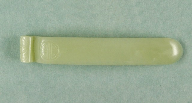 本文物為雕花白玉簪,為白色基底參雜部分綠色花紋,有雕花裝飾,整體為可插入頭髮的一股細長扁形玉。臺灣原住民及漢人皆會帶配飾,而就漢人而言女性使用飾品的比率比男性高。傳統社會中女性配戴的首飾,代表家族的財富及地位,尤其在嫁娶之時,以金銀飾品作為聘禮也十分常見。在臺灣貧者在嫁娶至少要有銀簪,而富者並無限制。因此,飾品不但反映當時社會的審美觀,也是女性及其背後家族之社會地位之象徵。