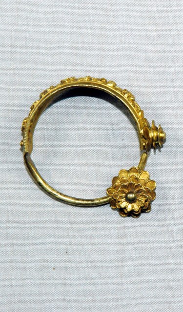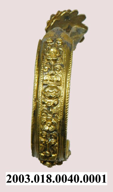 本文物為雕花鎏金耳環左耳,整體為環狀,其中一半為較寬之金屬附加雕花裝飾,另一半為無裝飾的戲金屬連接鎏金花朵,上有一可固定的開關。鎏金為在金屬層外鍍上一層金,其比貼金工藝更為耐久。臺灣原住民及漢人皆會帶配飾,而就漢人而言女性使用飾品的比率比男性高。傳統社會中女性配戴的首飾,代表家族的財富及地位,尤其在嫁娶之時,以金銀飾品作為聘禮也十分常見。在臺灣貧者在嫁娶至少要有銀簪,而富者並無限制。因此,飾品不但反映當時社會的審美觀,也是女性及其背後家族之社會地位之象徵。