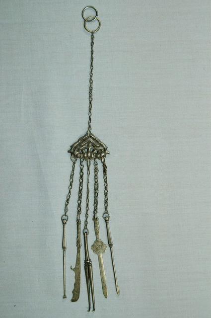 本文物為三角形金屬掛飾,分為鍊墜及鍊子兩個部件。鍊墜的部分主圖案為鏤空三角形金屬,上方寫雕有雙魚匯游的圖,下方垂墜刀劍綴飾。鍊子部分為金屬鎖鏈狀。整體而言有三層,第一層為掛環和金屬鍊,中間層為雙魚匯游鏤空三角形金屬,第三層為梅花劍、關刀、長槍等刀劍綴飾。臺灣原住民及漢人皆會帶配飾,而就漢人而言女性使用飾品的比率比男性高。傳統社會中女性配戴的首飾,代表家族的財富及地位,尤其在嫁娶之時,以金銀飾品作為聘禮也十分常見。在臺灣貧者在嫁娶至少要有銀簪,而富者並無限制。因此,飾品不但反映當時社會的審美觀,也是女性及其背後家族之社會地位之象徵。