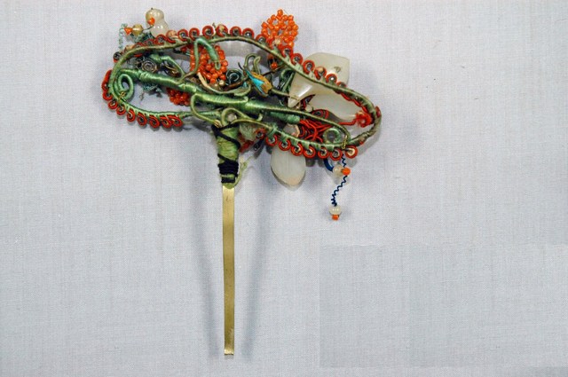 本文物為珊瑚珠頭花,裝飾的部分有紅線、綠線、珊瑚珠、白珍珠、白玉編成的花,呈現花團錦簇之貌。裝飾下方以綁線連接一股細長扁平的金屬簪子,使其可插入頭髮中固定。頭花為新娘出嫁時的髮飾,裝飾皆以代表吉祥的花,有早生貴子寓意的石榴為主。