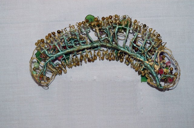 本文物為琥珀串珠方形頭花,裝飾的部分有琥珀色、粉色、綠色等串珠,及水藍色線編成,呈現花團錦簇之貌,整體為長方形髮梳貌。頭花為新娘出嫁時的髮飾,裝飾皆以代表吉祥的花,有早生貴子寓意的石榴為主。