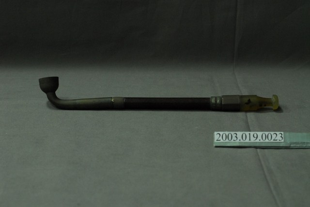 本物件為旱煙斗,中央的煙桿部分應是木頭製成,煙鍋為金屬材質,煙嘴應為橡膠或塑膠材質。整體略有使用痕跡與髒汙,但整體保存尚稱完整。