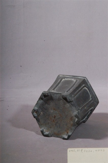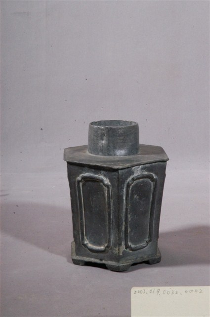 六角錫製茶葉罐罐身,造型仿中式花盆,罐頸為圓筒狀,罐身有方形線條,底為六角形,罐面出現受潮風化、磨損的跡象。