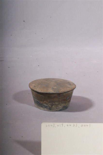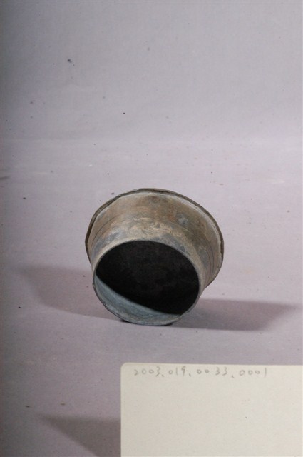 錫製茶葉罐圓形罐蓋,罐蓋側邊刻有兩圓環紋飾,上方鏽蝕嚴重,看不出紋飾花樣,整體出現受潮風化、磨損的跡象。
