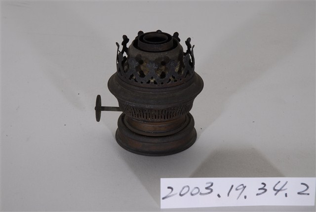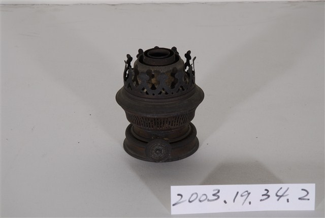 本件粉紅乳白玻璃煤油吊燈燈芯座為部件之2,通身以黃銅製作而成,主要放置於油燈壺口,可分為燈芯座與燈芯罩2部分。燈芯座為中心柱形,柱身內夾固棉燈芯,藉由器身一側的長桿旋鈕控制燈芯上下,藉此間接調整火光大小。燈芯罩外觀呈現上下透孔,四周鏤空的中空瓶形頭罩,其放置位置由燈芯柱頭套入。頂端口部作凸出三葉紋與倒V形之鏤空,可與玻璃燈罩套合。續接折肩,肩部以下逐漸收斂,器身中段緊密排列直線鏤空,利於空氣對流。