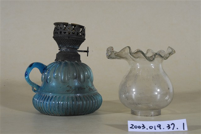 本件荷葉邊玻璃煤油燈為部件之1,其長11公分,寬10公分,高21.9公分,可分為燈罩、燈芯座與玻璃油壺3部件。燈罩為透明無色玻璃製作,外形頂端口折沿作荷葉邊,束頸下接球形鼓腹,底緣開短直口。燈芯座以黃銅製作,頂面開口呈長橢圓形,內夾固棉燈燈芯,藉由腰部一側的長桿旋鈕控制燈芯上下,藉此間接調整火光大小。燈芯座外層加套鏤空燈芯罩。油壺以藍色透明玻璃製作,短直口滑肩垂腹平底緣,一側帶有C形手把。器身上段為菊瓣紋,下端為垂直凸線紋。