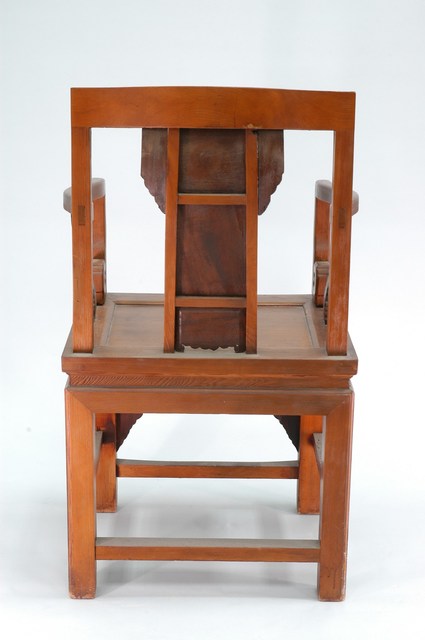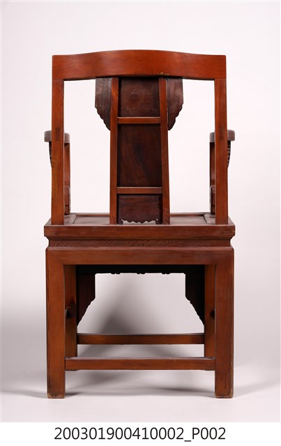 1. 本藏品是木製太師椅,長61.8公分、寬51.4公分、高107.3公分,屬於一組六件的茄苳入石柳太師椅組中的一件。在造型上,本藏品椅背上端的「搭腦」不做裝飾,但以和緩彎曲的圓潤線條貼合人體曲線,扶手也做了類似的處理。椅背則在支架間嵌入背板,連接扶手與前腿的「鵝脖」下端做迴曲紋,扶手和椅面間的「聯幫棍」則為扁平片狀。椅面下有束腰,方中帶圓的四支椅腳之間做有「足間棖」連接補強,椅面下方與前腿之間則嵌有的「牙條」。
