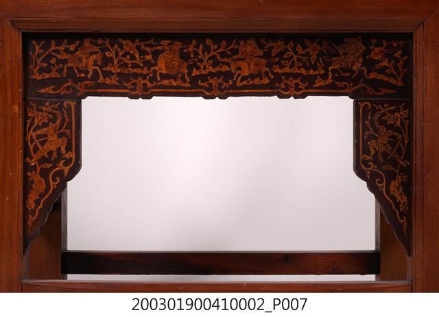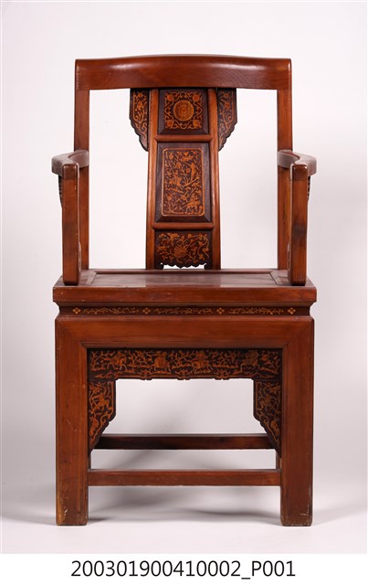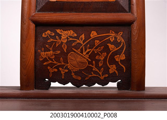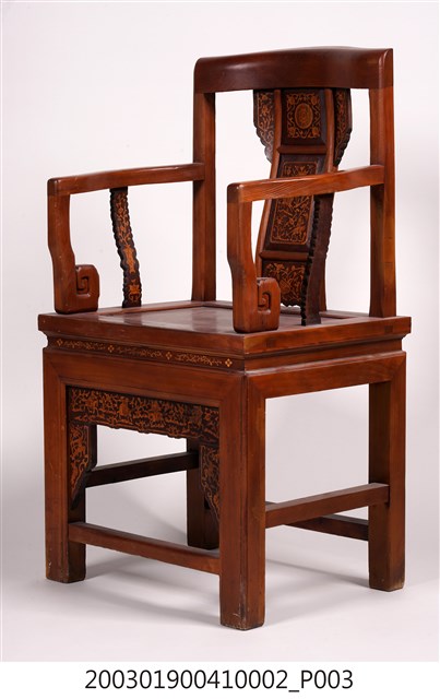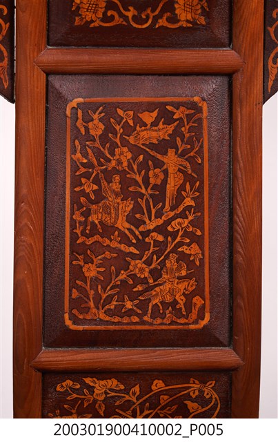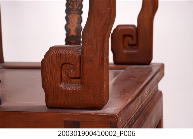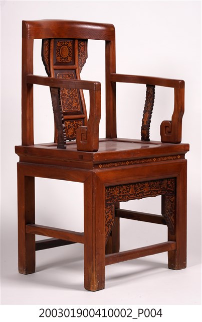 3. 在裝飾題材上,本藏品以吉祥花草紋、瓶花、器物為主,椅背下端的花草紋之間有花籃紋飾,為傳統吉祥暗八仙圖案之一,在側邊朝內的「聯幫棍」上,則嵌有象徵平安的瓶花。最精彩的裝飾是在椅背與牙條上,嵌有騎馬持戈的歷史演義「刀馬人」題材,「刀馬人」題材常見於傳統漢人桌案家具的裝飾上,在臺灣以封神演義或三國演義最為常見,除豐富視覺裝飾外,透過演義故事的表現,也常帶有忠孝節義的訓誡意味。值得注意的是,本藏品異木鑲嵌的裝飾部位都是朝向椅子的正面,背面與側邊皆不做紋飾,「聯幫棍」的鑲嵌面亦是朝向椅子內面,應是考量傳統廳堂家具擺設方式,要將裝飾面朝向使用者或觀者之故,這類茄苳入石柳的家具在臺南所產最為著名。本件太師椅整體而言結構紮實,裝飾簡繁相映、主次分明,造型線條方直中帶有圓潤之感。