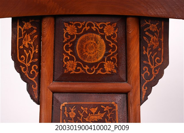2. 在裝飾上,本藏品以茄苳入石柳的異木鑲嵌的平嵌技法為主,在椅背、聯幫棍、束腰、牙條上施做繁密的紋飾。茄苳入石柳是以深淺不同色澤的木材作為鑲嵌材料,透過「木鑲木」形成色彩差異的視覺效果。