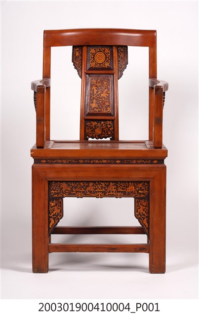 2. 在裝飾上,本藏品以茄苳入石柳的異木鑲嵌的平嵌技法為主,在椅背、聯幫棍、束腰、牙條上施做繁密的紋飾。茄苳入石柳是以深淺不同色澤的木材作為鑲嵌材料,透過「木鑲木」形成色彩差異的視覺效果。
