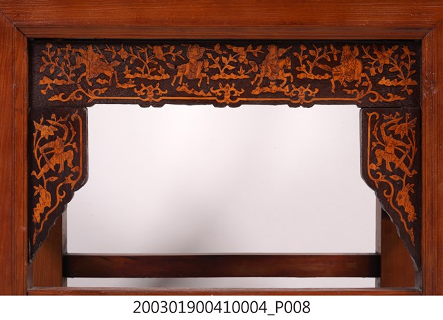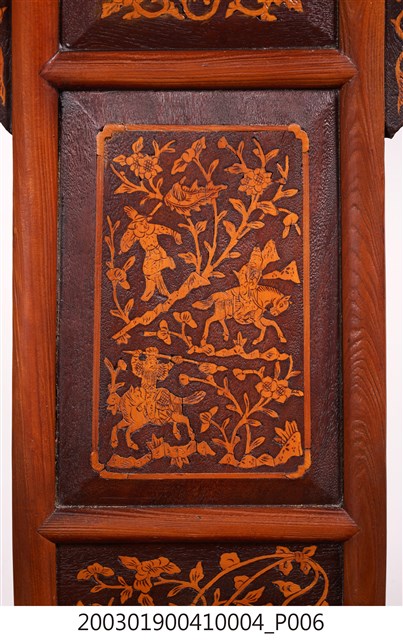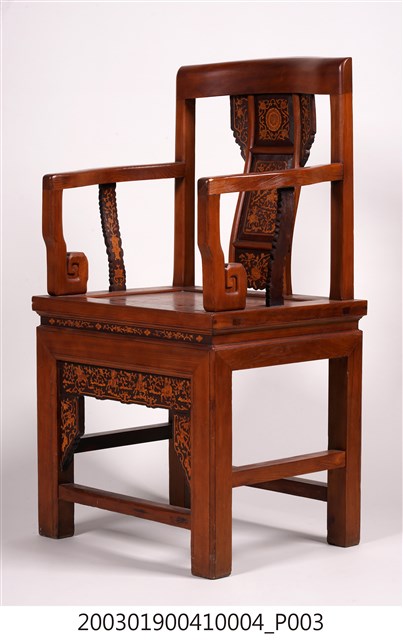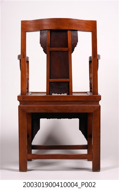 3. 在裝飾題材上,本藏品以吉祥花草紋、瓶花、器物為主,椅背下端的花草紋之間有花籃紋飾,為傳統吉祥暗八仙圖案之一,在側邊朝內的「聯幫棍」上,則嵌有象徵平安的瓶花。最精彩的裝飾是在椅背與牙條上,嵌有騎馬持戈的歷史演義「刀馬人」題材,「刀馬人」題材常見於傳統漢人桌案家具的裝飾上,在臺灣以封神演義或三國演義最為常見,除豐富視覺裝飾外,透過演義故事的表現,也常帶有忠孝節義的訓誡意味。值得注意的是,本藏品異木鑲嵌的裝飾部位都是朝向椅子的正面,背面與側邊皆不做紋飾,「聯幫棍」的鑲嵌面亦是朝向椅子內面,應是考量傳統廳堂家具擺設方式,要將裝飾面朝向使用者或觀者之故,這類茄苳入石柳的家具在臺南所產最為著名。本件太師椅整體而言結構紮實,裝飾簡繁相映、主次分明,造型線條方直中帶有圓潤之感。