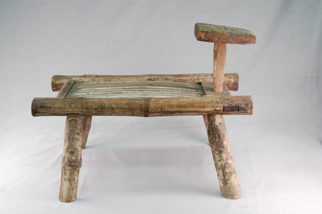 1.本物件為竹製品,由數片竹子與竹片組成之凳子,在前方並有可握或是可放置挫簽之裝置。 2.用途:可以當成一般椅子乘坐,也可以將挫簽要用的板子置於上面,方便施力。