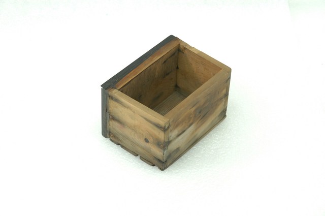 本件為漢洋混合風格梳妝臺的左抽屜,長13.4公分、寬10.1公分,高8.3公分,整體造型簡單,以多塊木板組合而成,用榫卯的鐵釘連結,僅正面上有黑漆,板堵做起線,中央有圓柱形金屬拉把一個。
