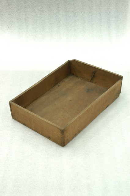 1.本藏品為木製朱漆墨繪木櫃的兩個內部抽屜中的一個,長34公分、寬48公分、高12公分,長方形的盒狀器身,以榫卯結構組合而成,抽屜的正面中央有一個圓形金屬屜環,方便使用者拉出使用。做為櫃子的內部抽屜,通體沒有施加油漆,也無加上任何裝飾,可見木材原色,給人簡單實用之感。