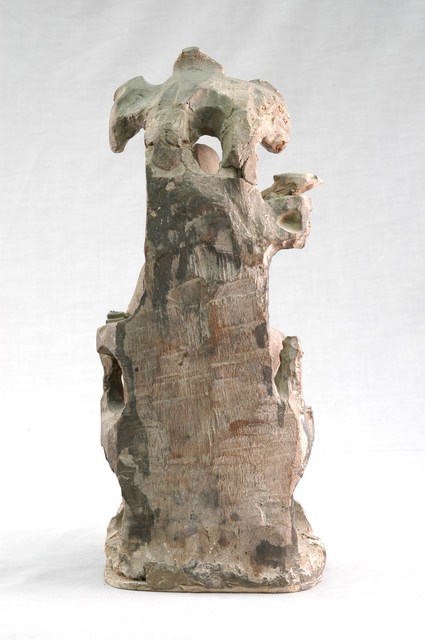 本件為木雕觀音神像,自在坐姿態於普陀岩,神態優雅安詳,右手放在撐起的右腿上,左手掌捧一珠。右側身後有一隻白鸚鵡停於岩石上。神像上彩,目前脫落嚴重。觀音信仰源自印度佛教,初為男性人物,東傳中國漢化轉變為溫柔的女性形象。
