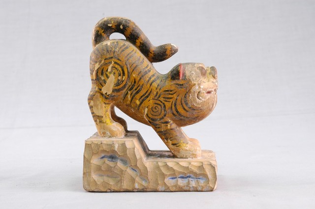 本件為木雕虎爺神像,彩繪有底座,虎身黃底黑斑虎紋,虎身上彩多處掉漆。頭低臀高翹尾的下山虎型態,頭部直視前方,開口露出門牙。呈現戇厚樸拙的可愛樣子,頗有親和力。虎爺是民間信仰中的動物神,多為安奉於廟宇的神案下,以木雕或石雕為主。神職為神祇的坐騎或腳力,神格具有醫療(腮腺炎)、招財、兒童守護神等等。