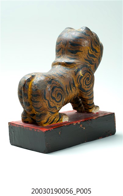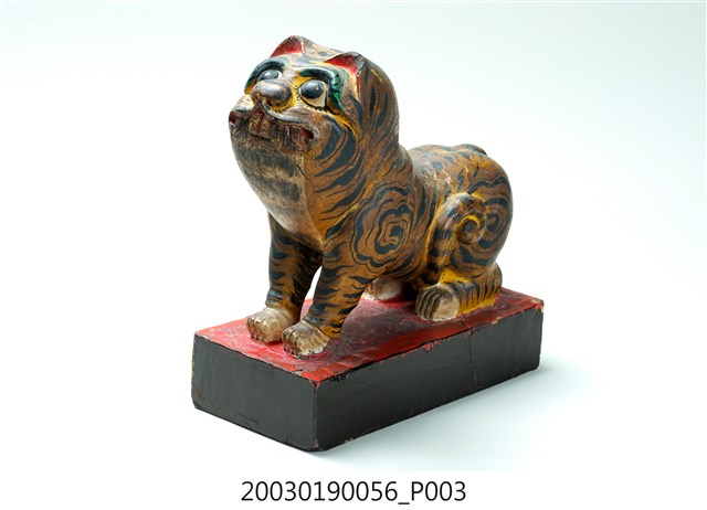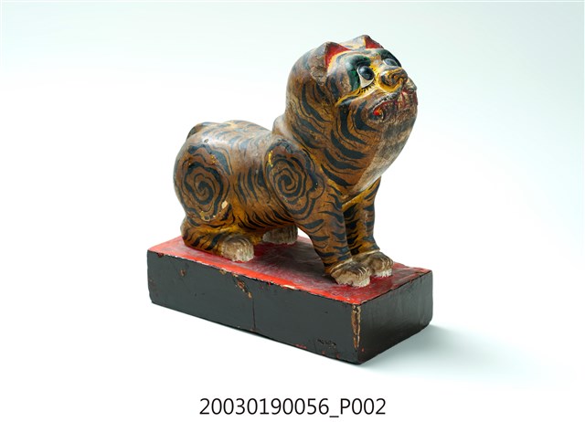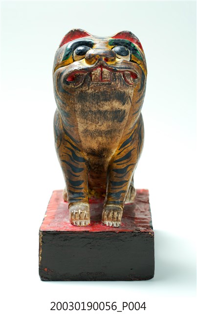 本件為木雕虎爺神像,彩繪有底座,虎身黃底黑斑虎紋,蹲坐姿頭部直視。開口露出兩顆門牙和虎牙,呈現戇厚樸拙的可愛樣子,頗有親和力。虎爺是民間信仰中的動物神,多為安奉於廟宇的神案下,以木雕或石雕為主。神職為神祇的坐騎或腳力,神格具有醫療(腮腺炎)、招財、兒童守護神等等。