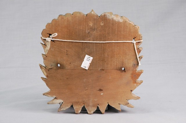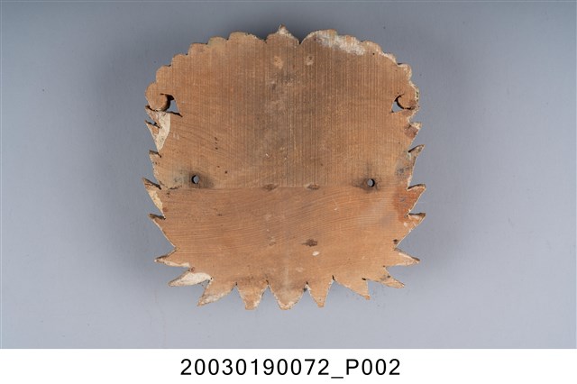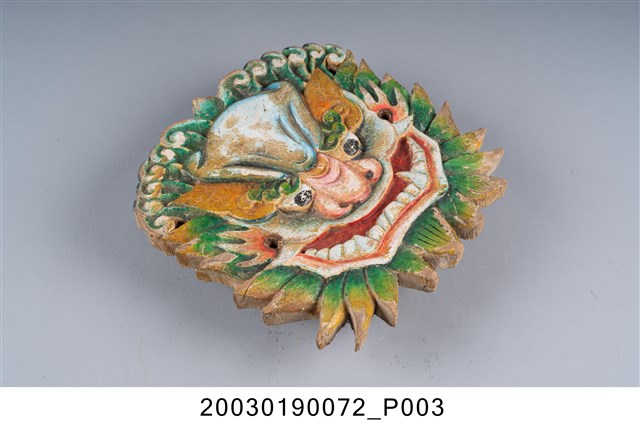 本件獅頭獸牌以木雕彩繪方式製作,其形式以獅子的鬃毛外圍為輪廓。獅頭臉部顏色繽紛,主要有天藍、金黃、綠、粉紅、紅等色,外圍之鬃毛為綠色。獅頭張開血盆大口,露出上排犬齒與下排牙齒,作疵牙列嘴狀,雙眼圓睜作向下俯視。左右兩頰各鑽有一個小孔,可供釘掛。獅頭上額未見王字符號,口中亦未作啣劍,為少見的獸牌形式。