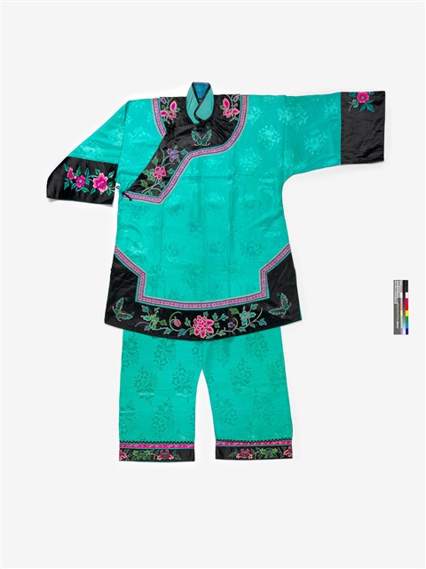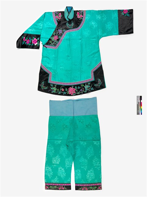 2003.019.0084 水藍絲質緹花大襟鑲緄女衫褲