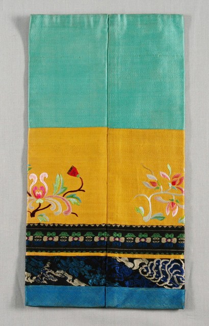 此飾褲為雙色絲緞拼接而成,由粉綠色和金黃色絲緞剪接縫製,下端貼飾二段寬版的織帶,上段為黑底白綠相間的緹花織帶,下端者為黑底藍白紋緹花布料,褲口部分再以寶藍色絲緞鑲緄飾邊。金黃色絲緞部分以五彩絲線刺繡折枝花卉,刺繡技法有長直針、纏針、搶針和緞面針法等,用色秀麗明豔,搭襯在明亮的黃絲緞上,更顯得富麗華貴,應屬於年輕婦女搭配禮服用的飾褲。