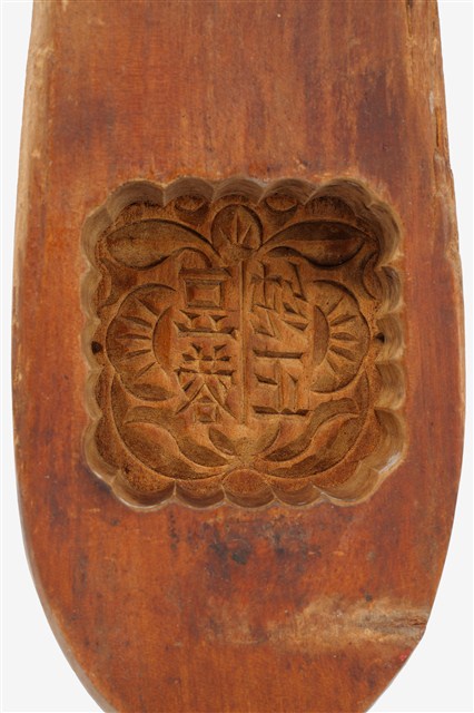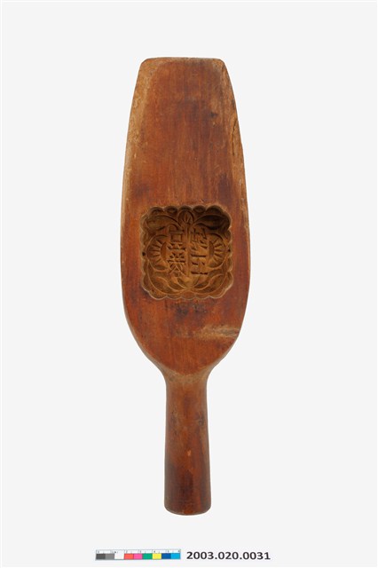 2003.020.0031 酒瓶形單面雕方花形文字紋帶柄餅印