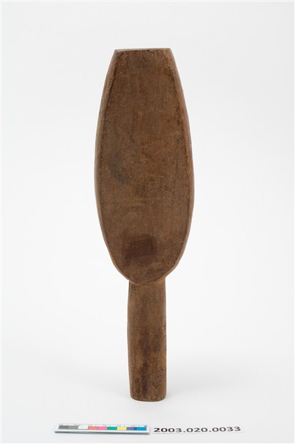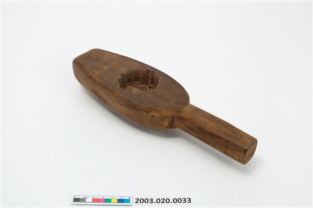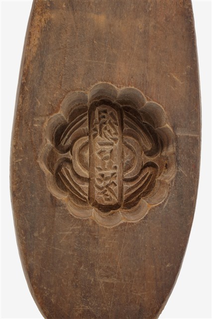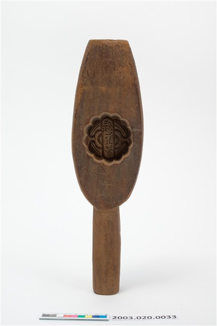 2003.020.0033 酒瓶形單面雕圓花形文字紋帶柄餅印