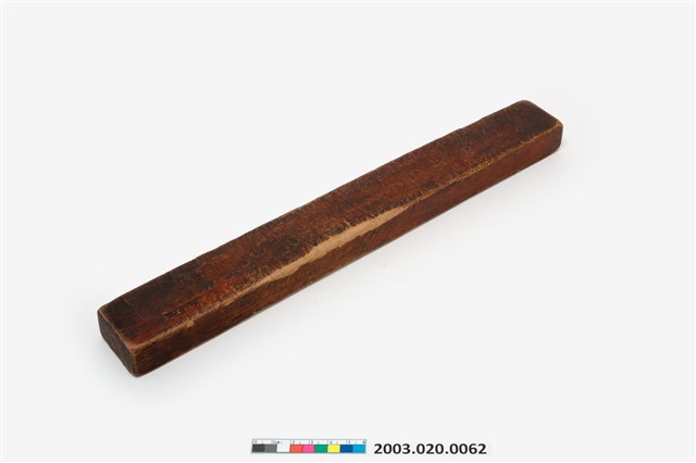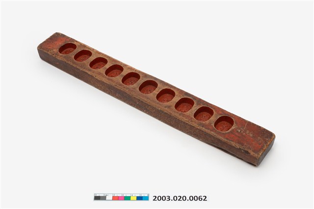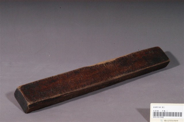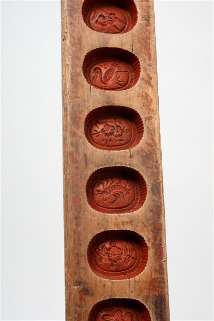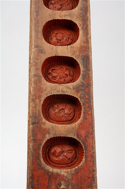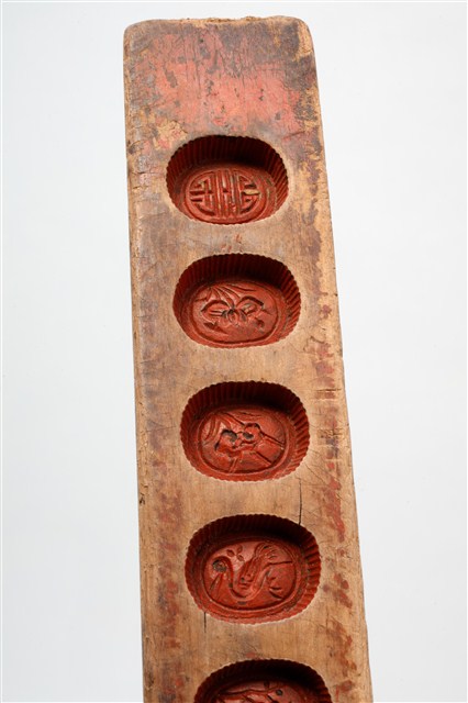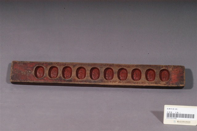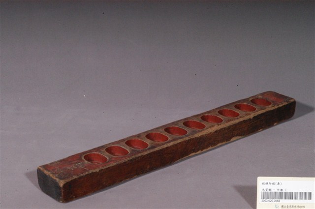 長條板單面雕十枚橢圓花文字紋糕印,一次可壓印十枚橢圓花紋形糕仔,由上而下,第一枚刻「壽」字,第二枚刻蓮花,第三枚刻蘭花,第四枚刻仙鶴,第五枚刻梅花,第六枚刻蝦,第七枚刻桃花,第八枚刻芭蕉扇,第九枚刻鳳梨,第十枚刻仙鶴。印模上刷有朱漆,推測應是嫁妝之物,因所屬年久遠,有明顯脫漆,尤其是側面與背面,幾乎看不到漆色。整體模具佈滿多道敲擊的凹痕,且有不少裂痕,可見其使用的頻繁程度。整組糕模的紋飾皆為臺灣民俗糕餅製作模具中常見的圖案,呈現出的是福、祿、壽、子、財、順、善的概念。