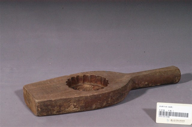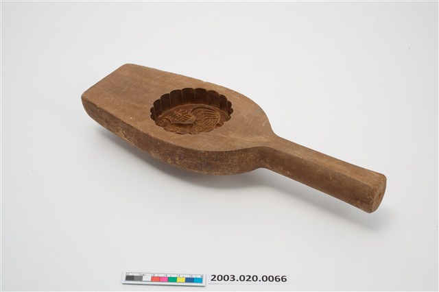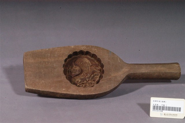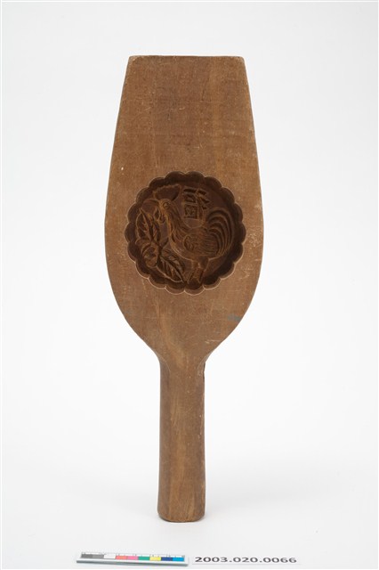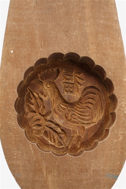 2003.020.0066 酒瓶形單面雕福雞紋帶柄餅印