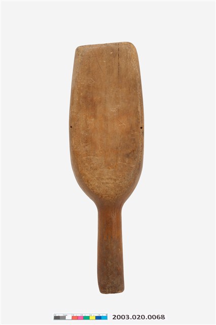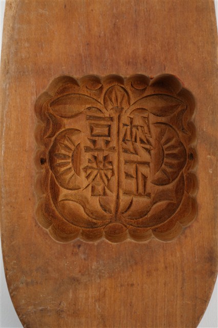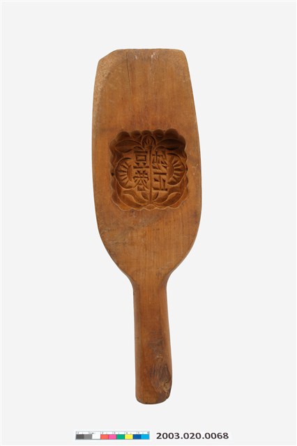 2003.020.0068 酒瓶形單面雕方形桃花紋帶長柄餅印