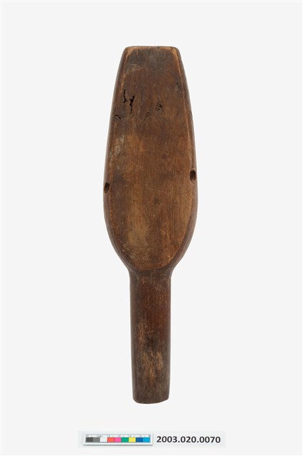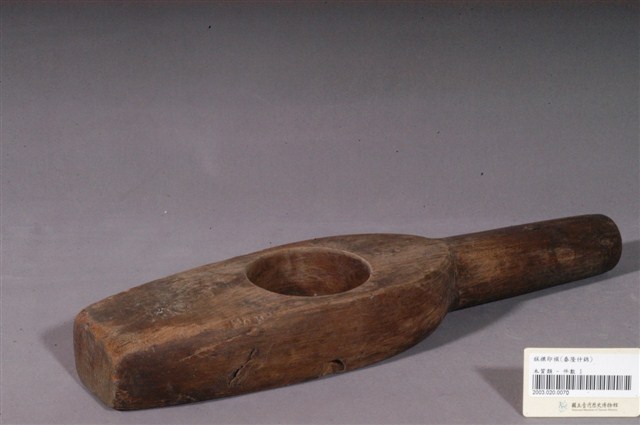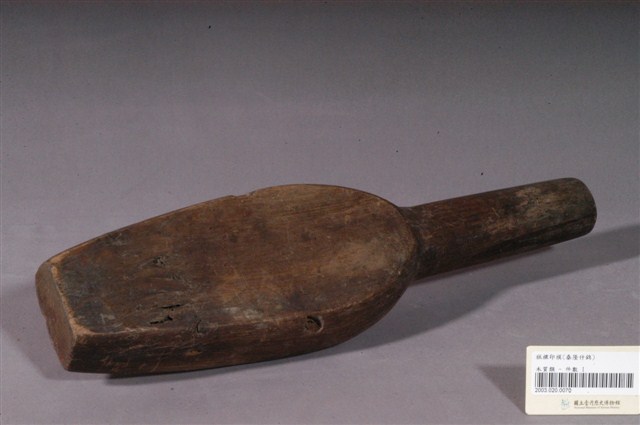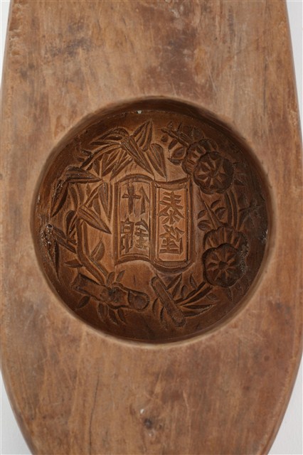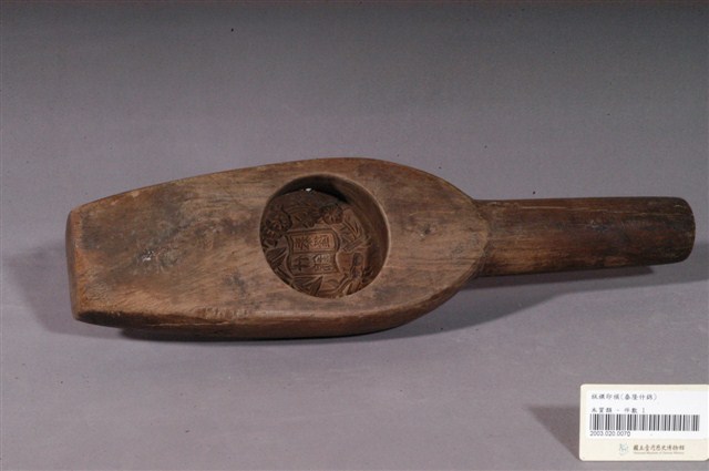 2003.020.0070 酒瓶形單面雕圓形花草紋帶柄餅印