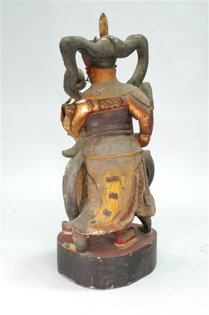 韋馱是佛教的護法神,在臺灣的佛寺內,通常以立體之雕像安置於主尊的左右側,與伽藍尊者成對;但亦有單獨的韋陀尊者,立於主尊像背後設置方式。韋馱像通常身穿甲冑,手持降魔杵,拿的方式有不同變化,有的時候合掌,寶杵放在手背上,有時則是以杵柱地。本件韋馱菩薩,身穿甲冑,手持金剛杵,以杵拄地,身飄有綬帶,神情威武。