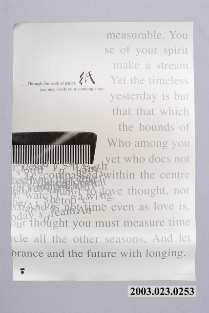 1.本件紙主題海報作品12「理思緒(系列2)」是以乳白色為底,分布著英文,中間靠右有一枝黑色梳子,象徵由上梳理下來的一堆英文字塊雜亂地堆積於梳子的下方,上方空白處有「紙」與2串英文字。2.海報是由文字、造型與色彩所組成,是傳達一個意念整體形象的重要表徵3.「臺灣之美」展覽為民國83年由林磐聳擔任「Taiwan Image 臺灣印象海報設計聯誼會」創會會長,在民國83年首度辦理「臺灣之美」的展覽。