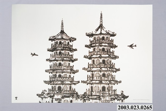 1.本件為林宏澤設計「發現福爾摩沙」海報,以白色為背景,以黑色線條畫出高雄著名景點蓮池潭的龍虎塔,天空再點綴2架飛機於塔的兩側。2.林宏澤,現職臺南應用科技大學視覺傳達設計系專技教授。臺灣海報設計協會(TPDA)策劃的「發現亞洲國際海報邀請展」於2002年9月28日開幕。邀請設計家們為其所居住的國家或地區具有的獨特特色提出海報設計作品,便能理解並勾勒出亞洲的整體印象,共計收到16個國家、126位設計家的159件作品。3.海報是由文字、造型與色彩所組成,是傳達一個意念整體形象的重要表徵。