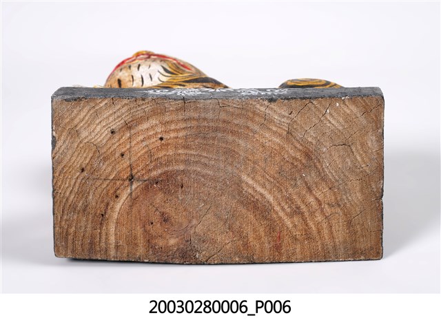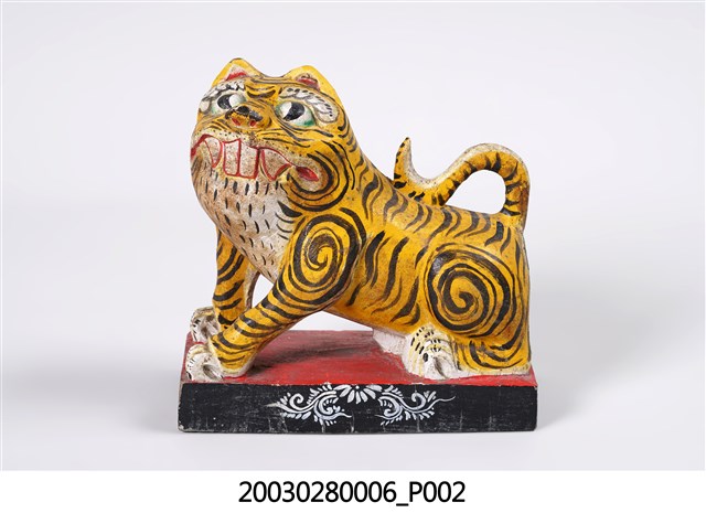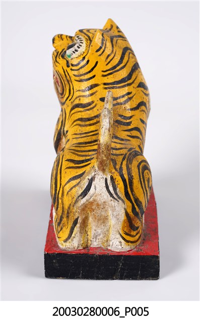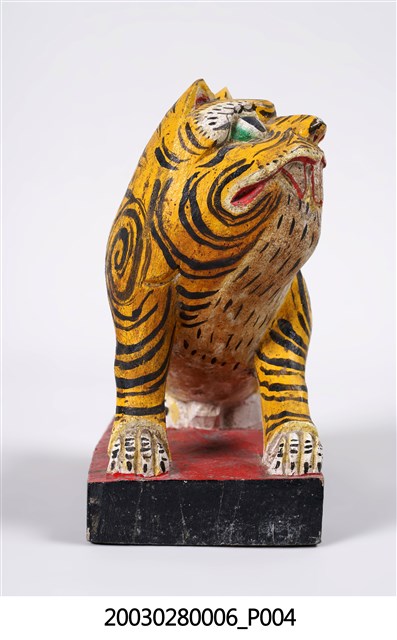 本件為木雕虎爺神像,彩繪有底座,底座繪菊花紋,虎身黃底黑斑虎紋,蹲坐姿轉頭側視。開口露出兩顆門牙和虎牙,呈現戇厚樸拙的可愛樣子,頗有親和力。虎爺是民間信仰中的動物神,多為安奉於廟宇的神案下,以木雕或石雕為主。神職為神祇的坐騎或腳力,神格具有醫療(腮腺炎)、招財、兒童守護神等等。