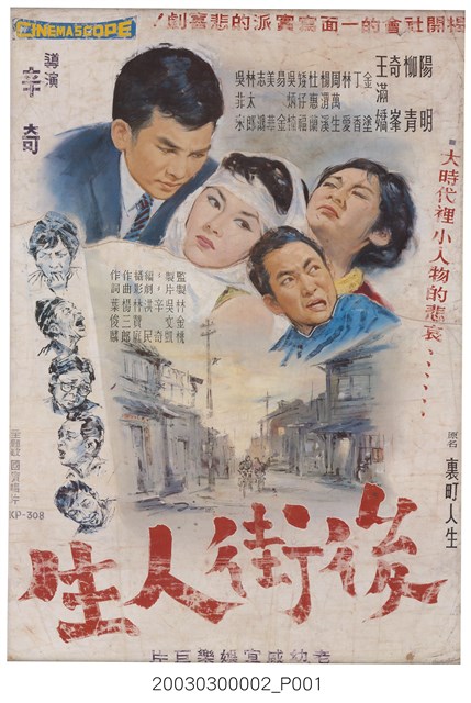 1.臺灣電影《後街人生》上映時的陳子福所繪中文彩色海報,直式繪製,黑色木頭裱框。畫面主要呈現四位主演在劇中的造型,以及後街的場景。搭配「揭開社會的一面寫實派的悲喜劇!」、「大時代裡的小人物悲歌」等文案字樣。