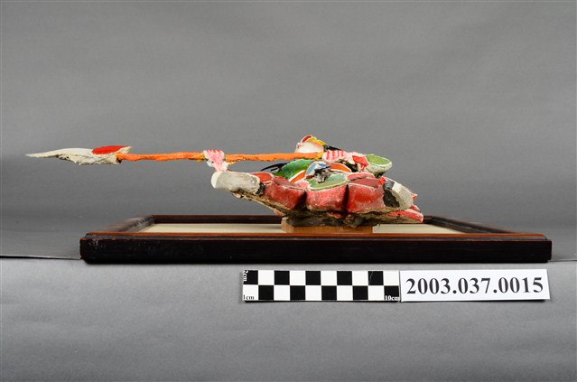 1.本件剪黏人物,採玻璃剪黏作法,由剪黏司傅陳乞及其徒弟陳世仁等人製作而成,原位於大稻埕慈聖宮前殿水車堵。人物造型為青年男子,雙手持火尖槍朝右平舉,面朝右看,雙腳往右跨出。瓷燒偶頭,長髮披肩、頭戴軟帽,身穿青綠色上衣、紅色褲子,肩上搭以深藍色領巾,腰帶繫以圓珠墜飾,並以白漆勾勒出衣飾線條。依其人物形象與手執兵器,推測本件可能為李哪吒。
