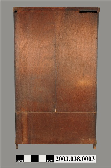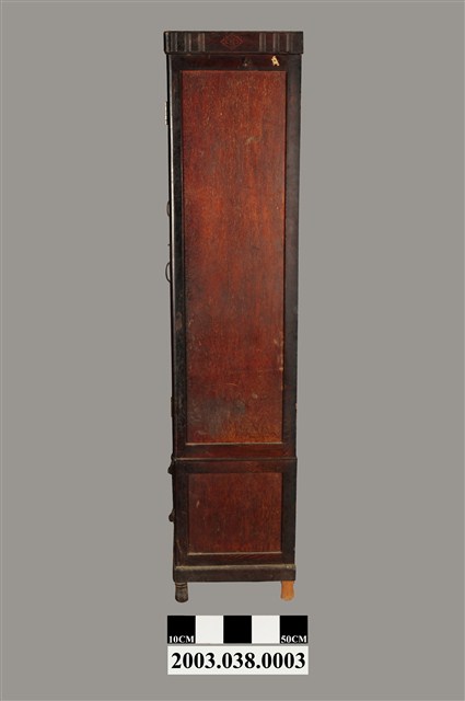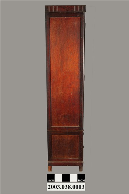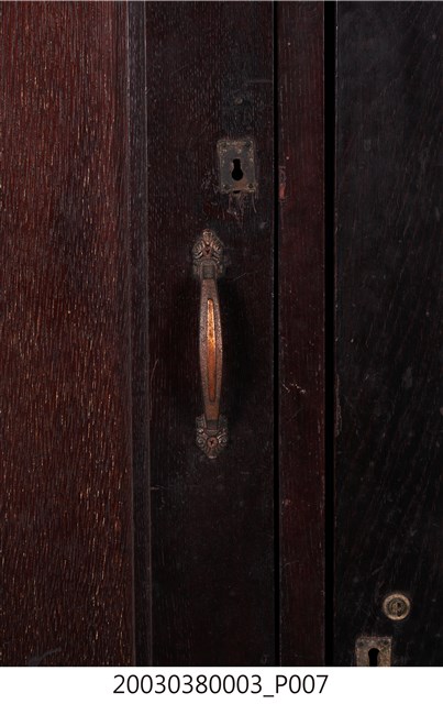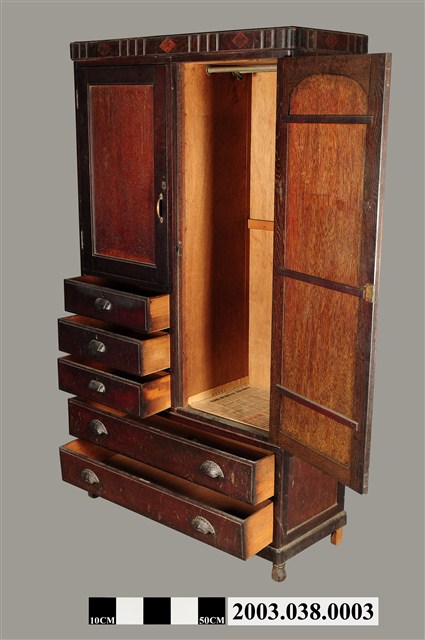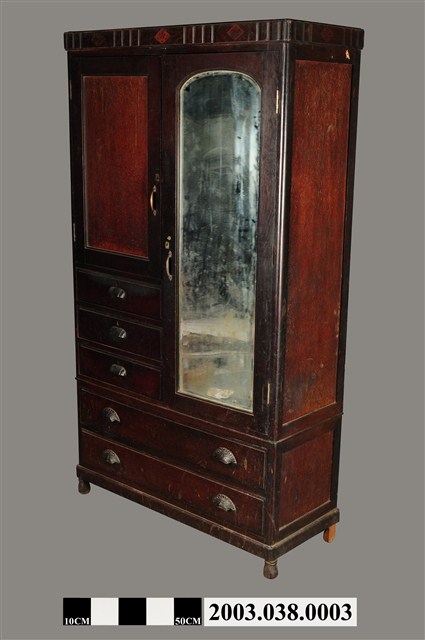 1. 本藏品為一長鏡衣櫃,長116.7公分、寬45公分,高207.5公分,依其構造可分為上下兩部分,上部的頂端以陰刻直稜紋與菱形花紋作為裝飾,其中菱形花紋還填以紅彩。上部的右側則是大長鏡,內部則唯一大型櫥櫃,左側上部為一拉門櫥櫃,下半則為三層抽屜,櫥櫃皆做有做有金屬拉把。衣櫃的下半部為兩層大型抽屜,各有兩個拉把,底部則有四足。