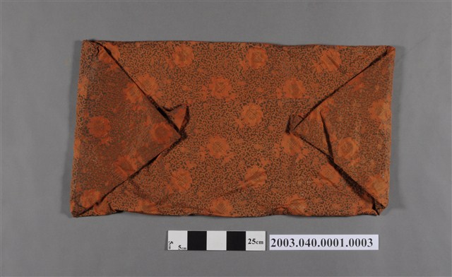 本文物為手搖式縫紉機布套,以橘色為底,有著圓形圖案,外圍環繞螺旋線條。用途為遮蓋縫紉機的布套,布套表面有些許的污漬。